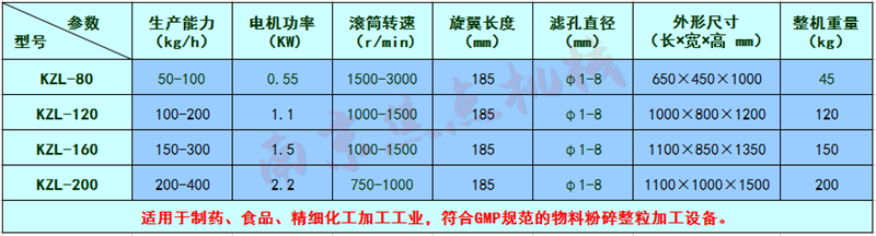 一、簡(jiǎn)介 KZL系列粉碎整粒機(jī)適用于制藥、食品、精細(xì)化工加工工業(yè),符合GMP規(guī)范的物料粉碎整粒加工設(shè)備。本機(jī)全部采用不銹鋼材料制造。 四、型號(hào)參數(shù)